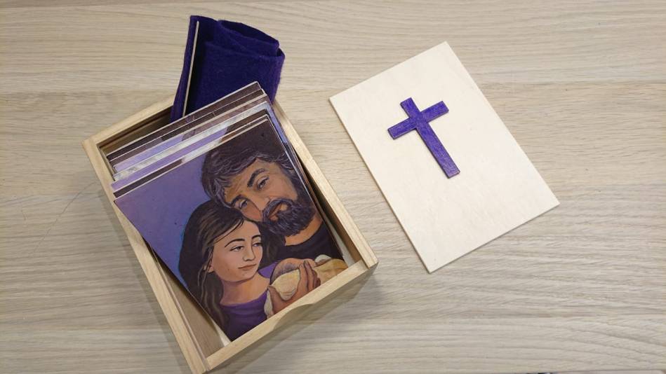 Verás, también, que el material es prácticamente idéntico al que se utiliza en una sala de Godly Play pero de un tamaño más reducido. Esto es para facilitar poder llevarlo de un lugar a otro. De todas formas, puedes hacerlo con el material habitual.