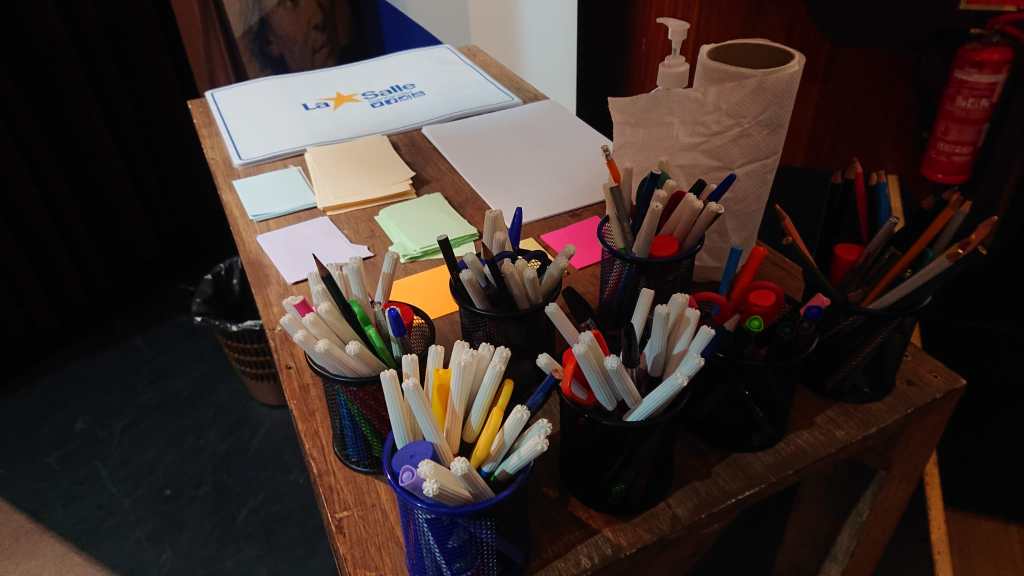 Hacemos tiempo de respuesta en la nueva normalidad. Cuando el grupo es reducido (catequesis) preparamos unos cubiletes con diferente material. (Ver imagen). Tienen a sus disposición diferentes hojas y papeles. En la mesa del tiempo de respuesta hay alfombrillas que se lavan después de cada uso y gel hidroalcohólico.