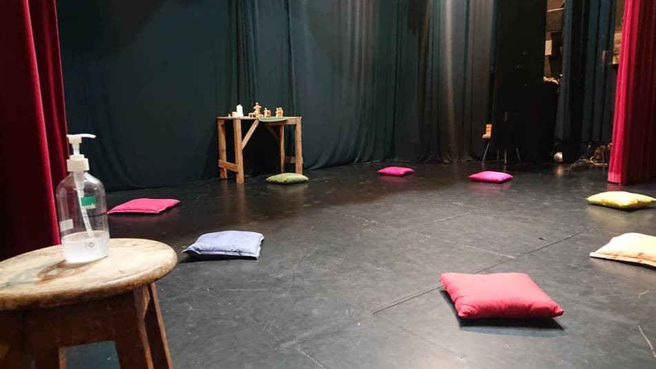 Lo primero era buscar un espacio. Debía ser amplio, despejado, que estuviese bien ventilado, y lo más difícil de todo, que no se usara habitualmente. Al poco de empezar encontramos un lugar que se ajustaba: el escenario del salón de actos. Tiene aproximadamente 50m2, está totalmente despejado y la sala tiene ventanas y varias puertas para la ventilación. Se usa en momentos muy concretos, por lo que podría ser compatible con la práctica de Godly Play.